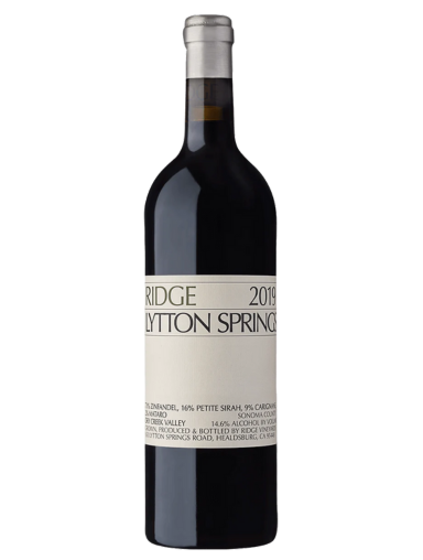 El vino Ridge Lytton Springs 2019 es un blend de uvas Zinfandel, Petite Sirah, Carignan y Mourvèdre, con Zinfandel como predominante. Es conocido por su opulencia, complejidad y potencial de guarda. El vino muestra aromas de bayas oscuras, pimienta, y notas de hierbas, con un cuerpo medio-completo y taninos bien integrados.